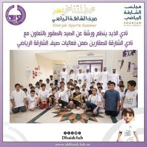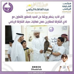 نظم نادي الذيد بالتعاون مع نادي الشارقة للصقارين ورشة الصيد بالصقور للمشاركين في الصيفي ضمن فعاليات الأسبوع الثالث من صيف الشارقة الرياضي عطلتنا غير أسبوع الهوية الوطنية